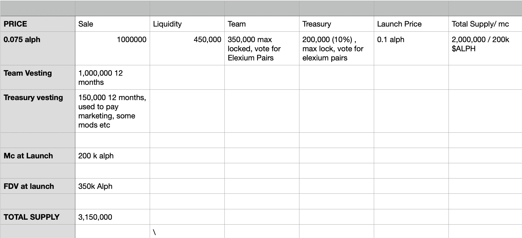 **The sale will be 1,000,000 tokens, at a price of 0.075 $ALPH, for a total of 75000 $ALPH.**&#x20;